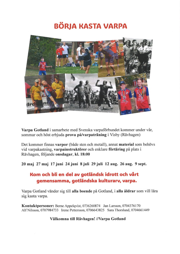 Varpa Gotland i samarbete med Svenska Varpaförbundet kommer under vår, sommar och höst att erbjuda pröva på/varpaträning i Visby (Rävhagen)